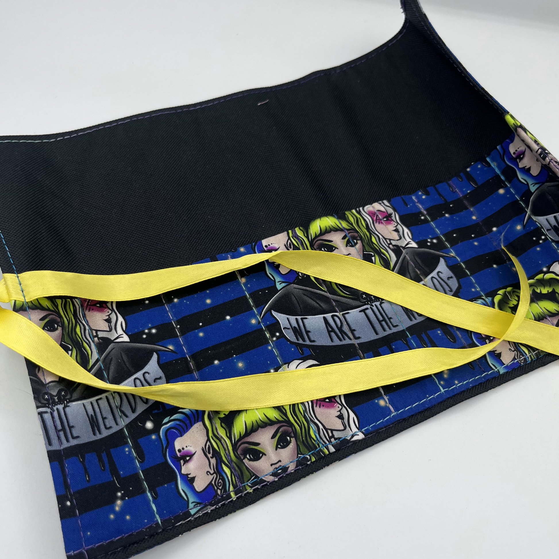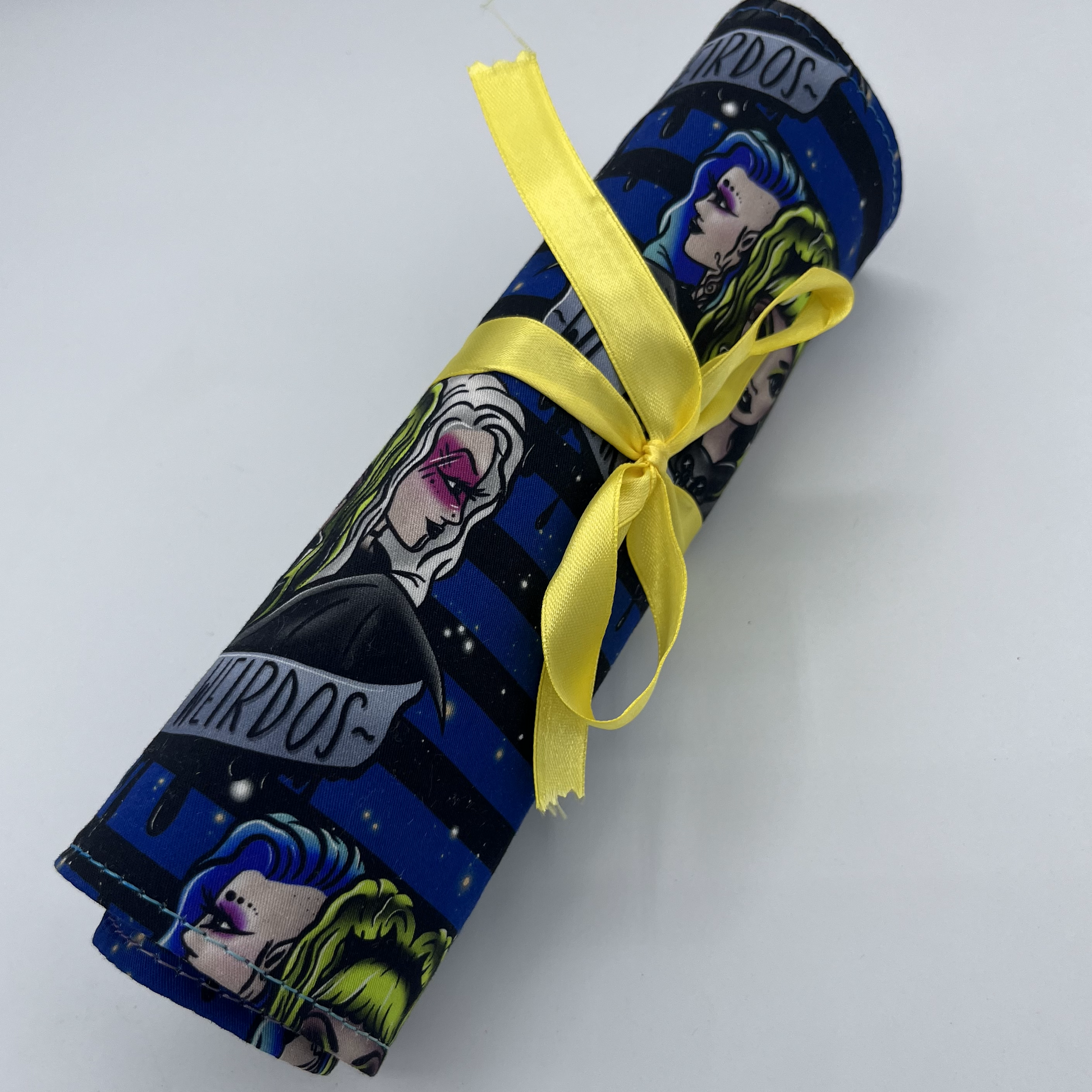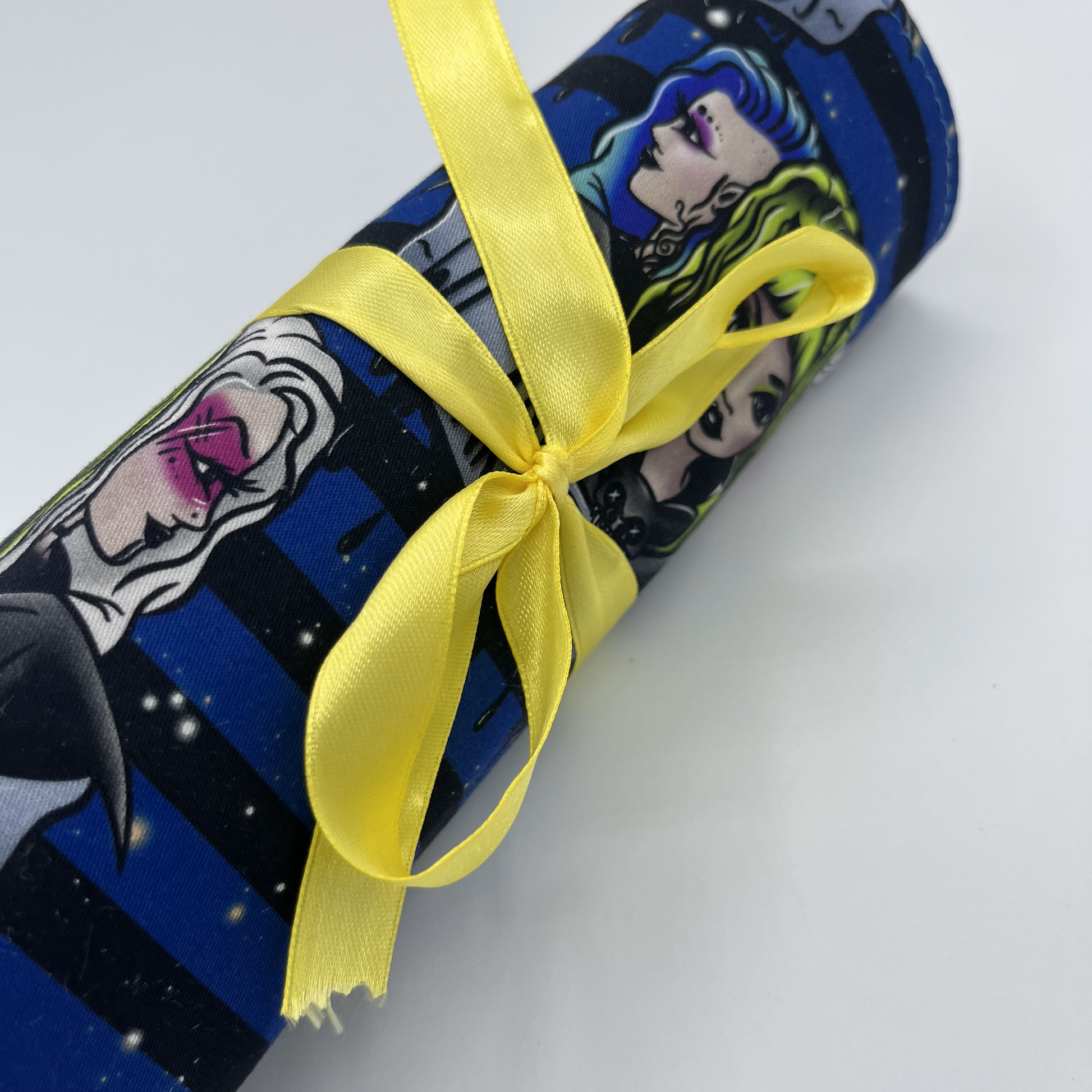 Keep your creative tools organized in style with this handmade brush wrap! Perfect for makeup brushes, paint brushes, or crochet needles, this geeky-themed organizer rolls up for easy storage and transport. Unfold to reveal your tools, then simply roll and go—because even artists and crafters need to embrace their inner neat freak sometimes!